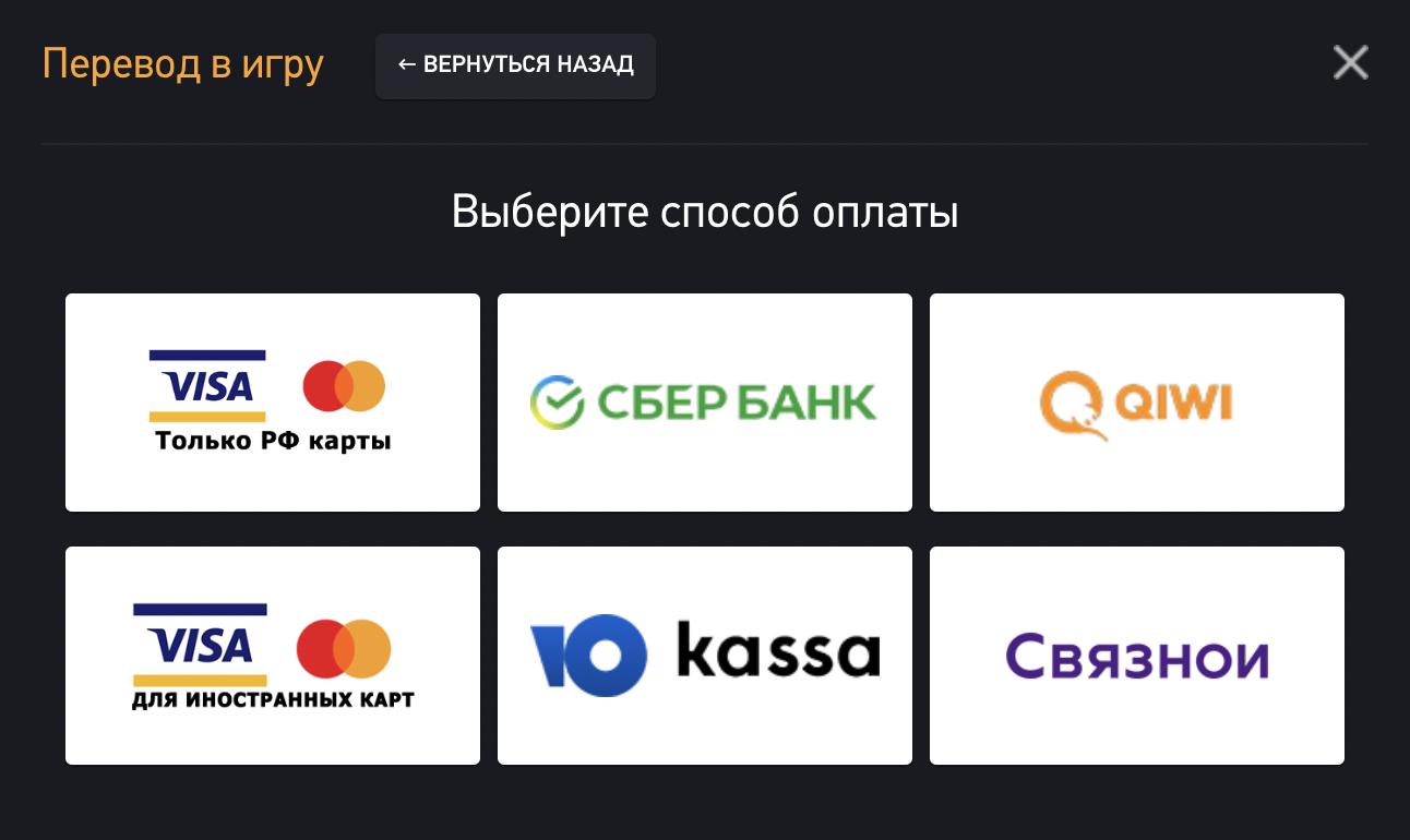 Из-за особенности архитектуры игровых клиентов, некоторые привычные способы оплаты (например, ЮKassa) могут не работать в игровом клиенте CreaGames. Всегда можно воспользоваться другим способом оплаты, но если использование недоступного в игровом клиенте способа оплаты предпочтительней, можно совершить платеж через личный кабинет на портале CreaGames. Не бойтесь, это быстрый и безопасный процесс!