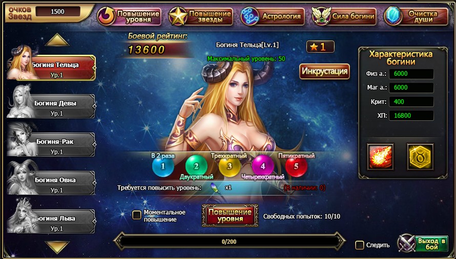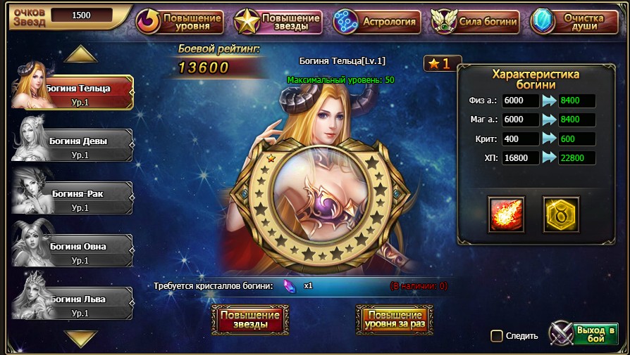 Для призыва первой богини Тельца надо собрать 1500 очков звёзд.