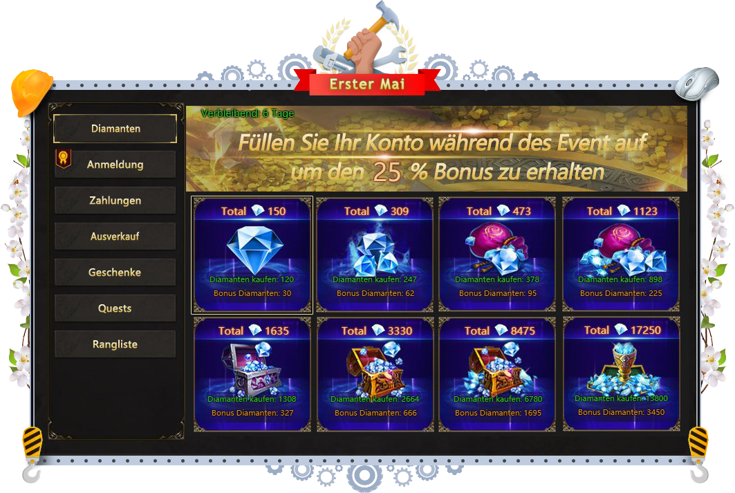 Anmeldung - besuchen Sie Tag der Arbeits Fest taglich und bekommen verschiedene Belohnungen;