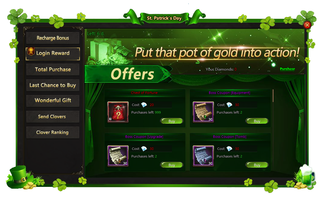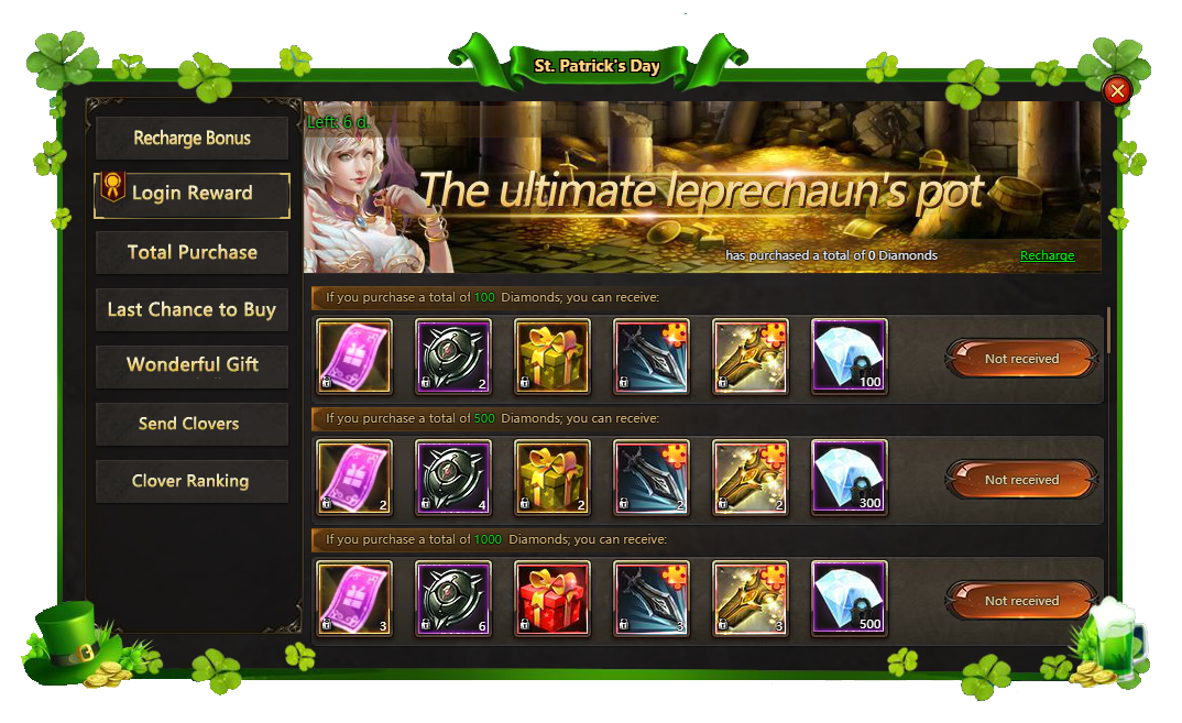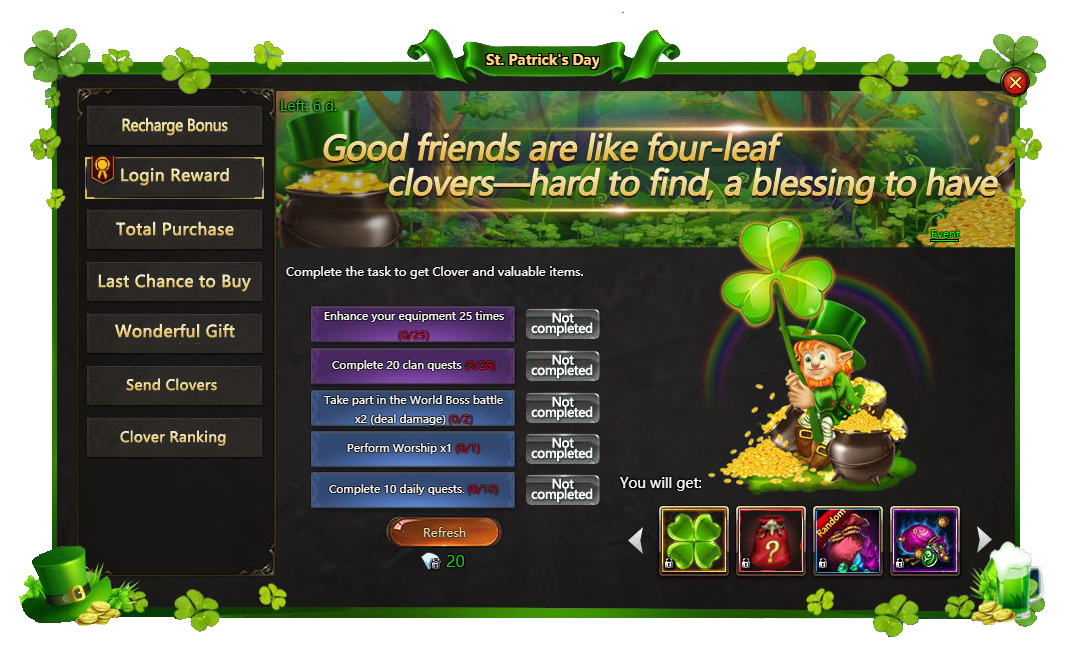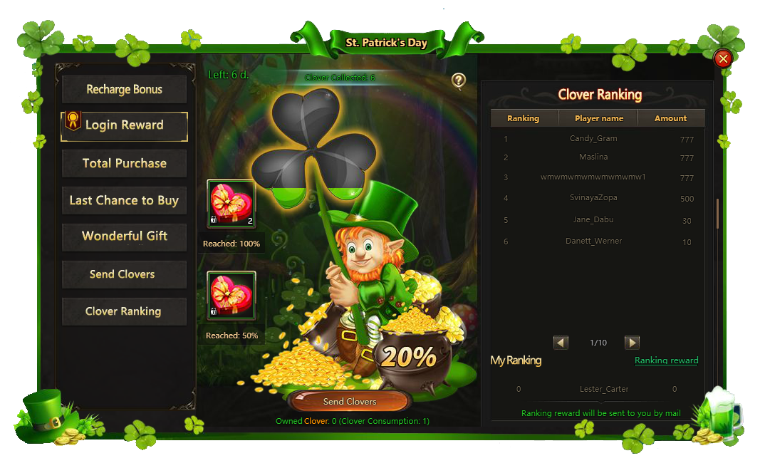 By sending clovers you fulfill the Clover Ranking, the whole server will receive lovely gifts for filling the rating bar. Share your luck with your friends and may the prosperity and fun always be with you.