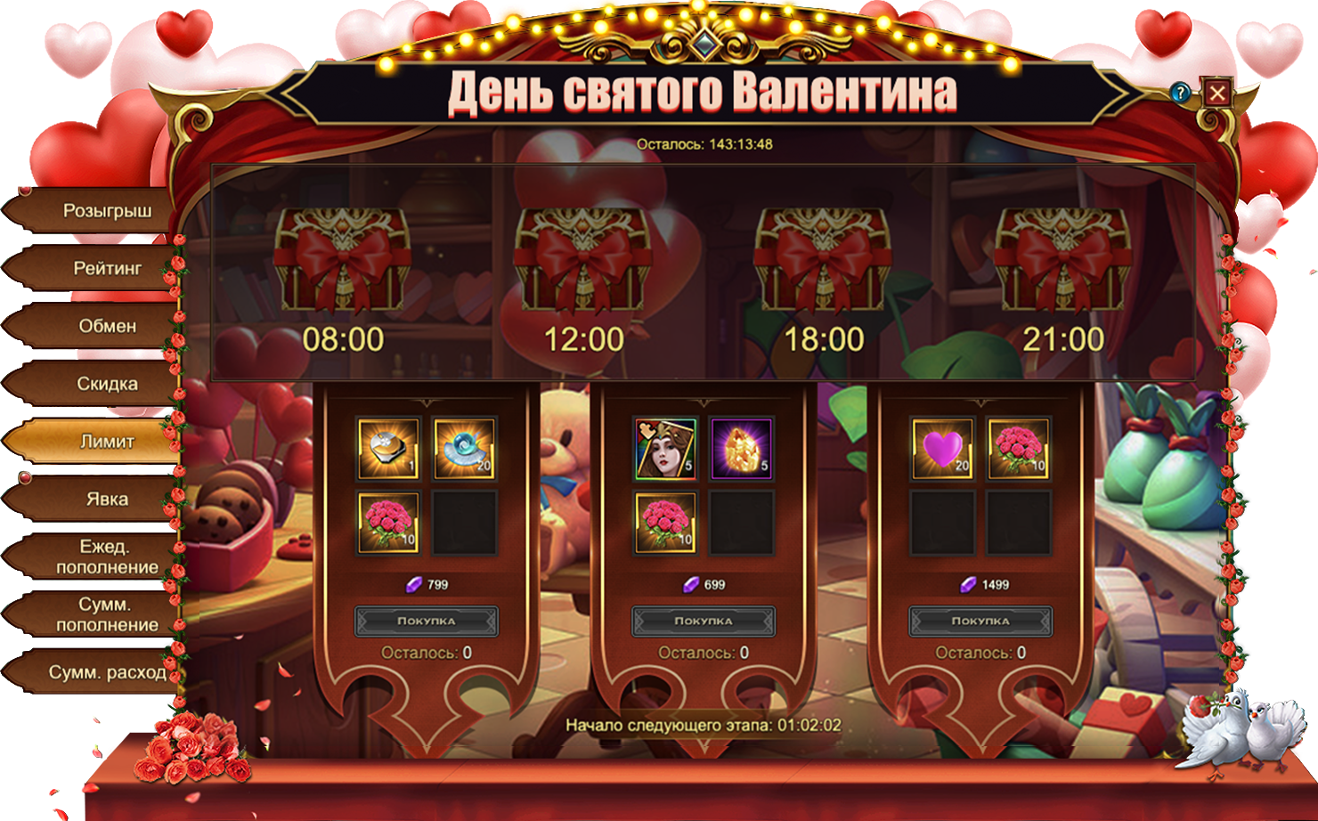 Обратите внимание, для активации скидки необходимо выполнить условие из первого столбца. Например, на скриншоте ниже, для приобретения со скидкой набора из 10 Сердечек и 10 Букетов роз необходимо пополнить счет на 1000.