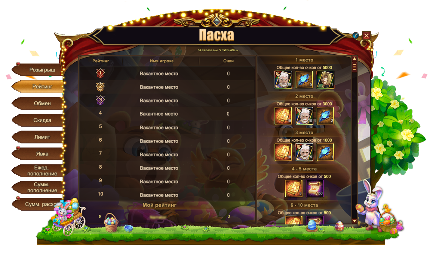 Корзинки, собранные во время данного Фестиваля, позволяют приобрести множество интересных предметов, в том числе и эксклюзивных для данного события: [Карта] Локи, титул Пасхальный Вестник[Аватар] КроликРамка на Пасху. Если эксклюзивные предметы вас не интересуют, всегда можно обменять Кроличьи монеты на полезные ресурсы. Например, на Знак разрушения, [Бог чести] Фенрир или Отличная марионетка.