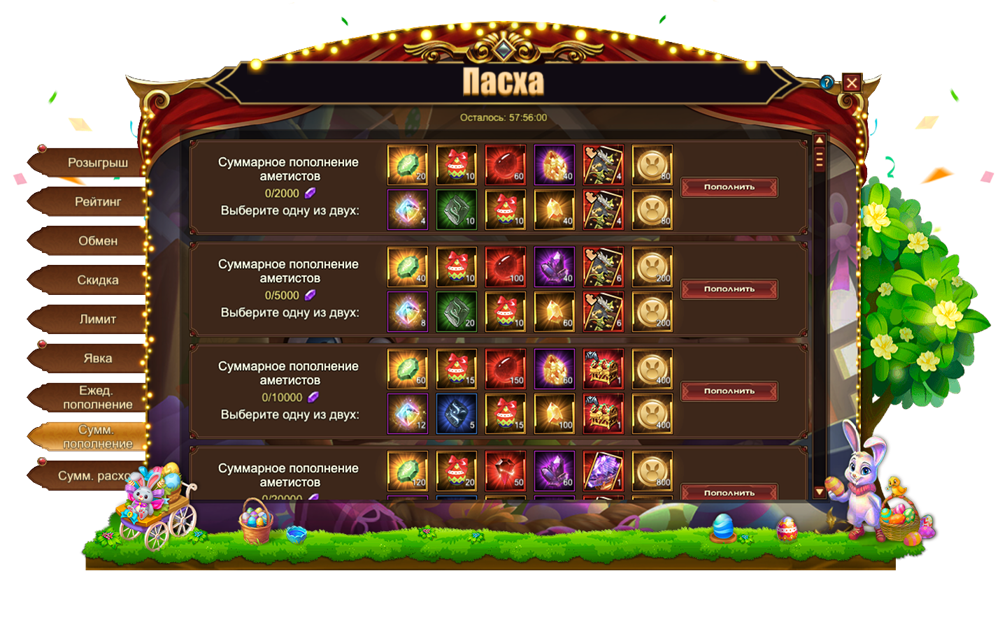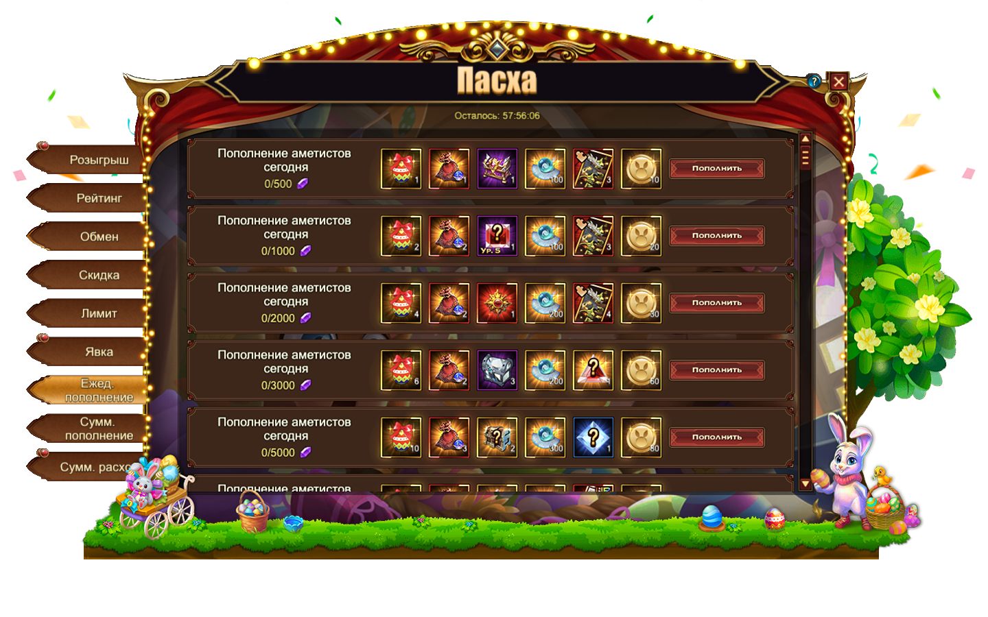 За пополнение счета на определенное количество аметистов за один день, вы можете получить: [Редк.] Стигмат, Сундук камней элементаля 4 ур., Сундук кристаллов 5 ур., Сундук самоцветов 6 ур., [Героич.] Стигмат, Праздничное яйцо, Кроличья монета, Эссенция талисмана, Сундук книг навыков, Сундук кристаллов 7 ур., Сундук кристаллов 9 ур., Сундук с эссенцией стигмата, Сущность артефакта, Сундук редкостейПисьмо с молитвойФрагмент гоблинаСундук карт UR, [Фрагмент карты] Тюр.