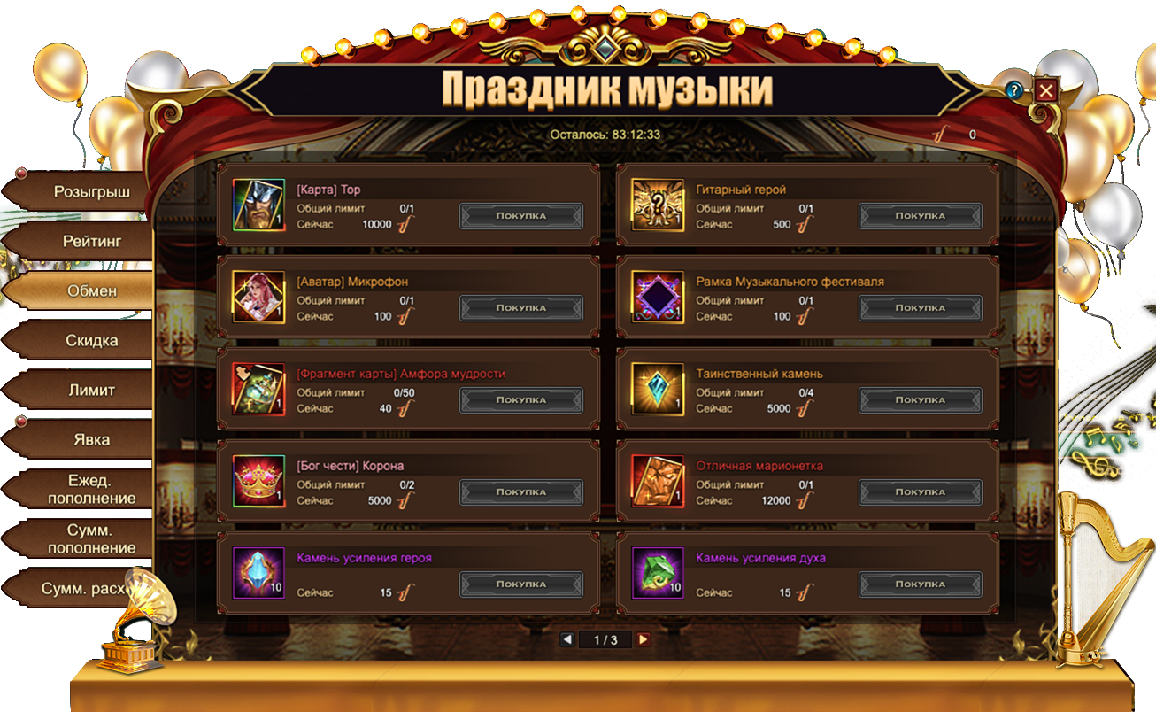 Здесь любопытные искатели приключений могут отыскать временные предложения, доступные в течение ограниченного времени и в ограниченном количестве. Группы товаров доступы с 8:00 до 11:59, с 12:00 до 17:59, с 18:00 до 20:59 и с 21:00 до 7:59. В этот раз вы можете получить в том числе: ЯнтарьЭссенция талисманаСаксофонНотыОбучающее устройство[Фрагмент Карты] Локи.