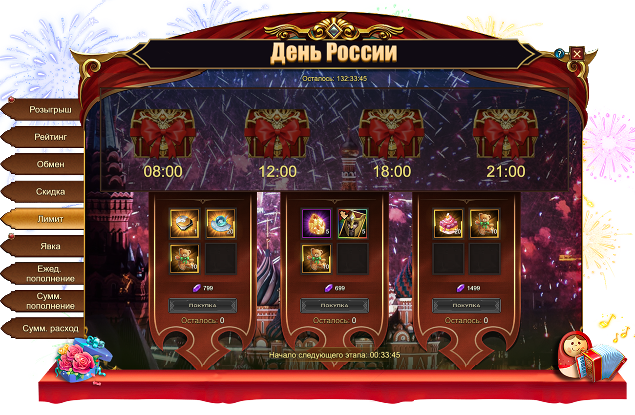 Сегодня, 11 июняв Eternal Fury Reborn запущены новые тематические события — День России, которые продлятся ровно шесть дней до 16 июня включительно. Наслаждайтесь летними деньками, забирайте ценные призы и заполучите все желанные награды!