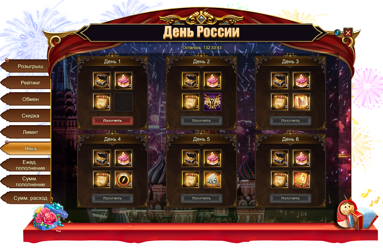 За посещение события ежедневно становятся доступны различные подарки. Например: Праздничный тортСумка золотаОранжевый свиток опыта, уникальный титул Двуглавый орелПотерянная картаПропуск на Арену и Свиток славы.