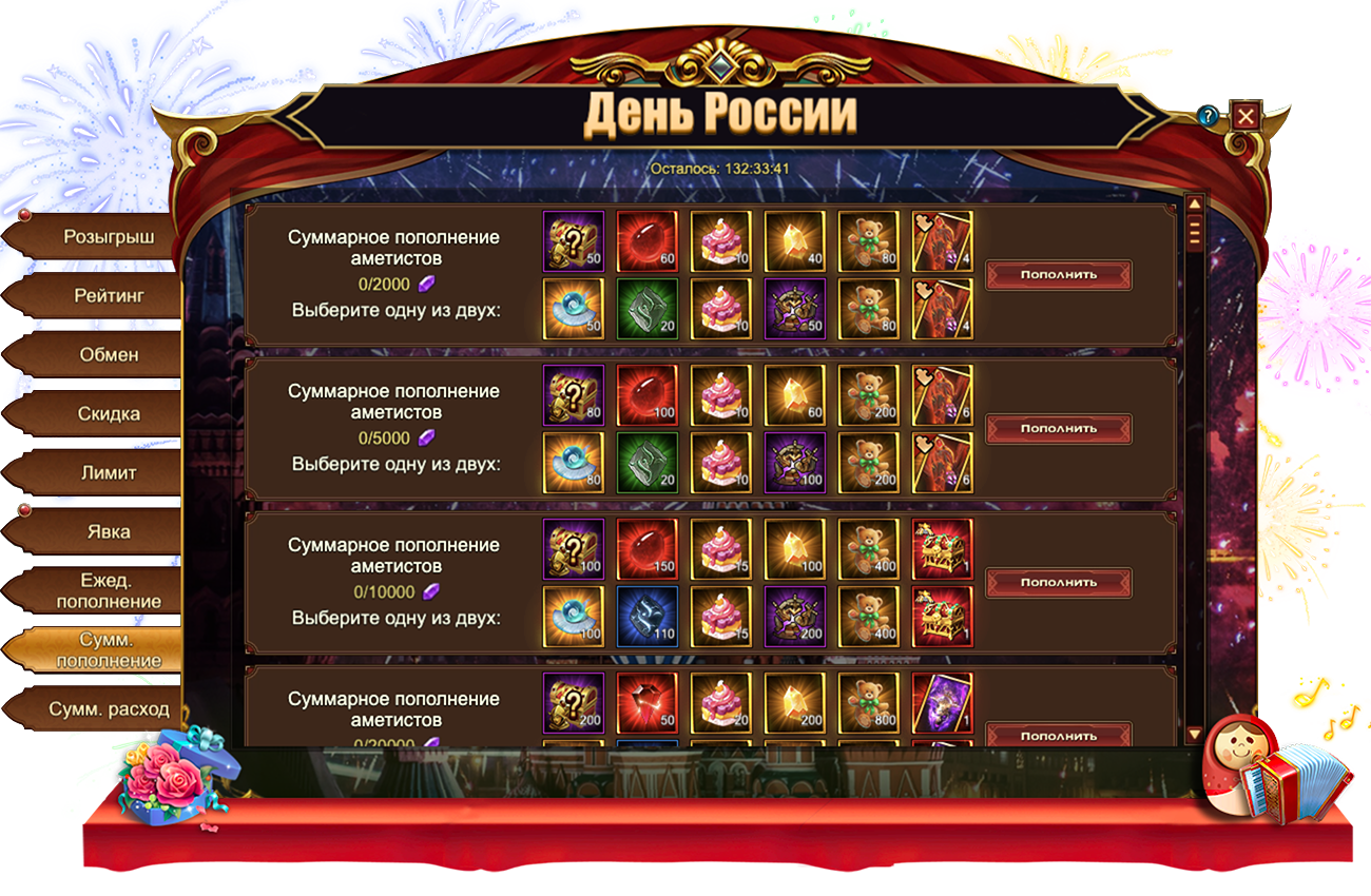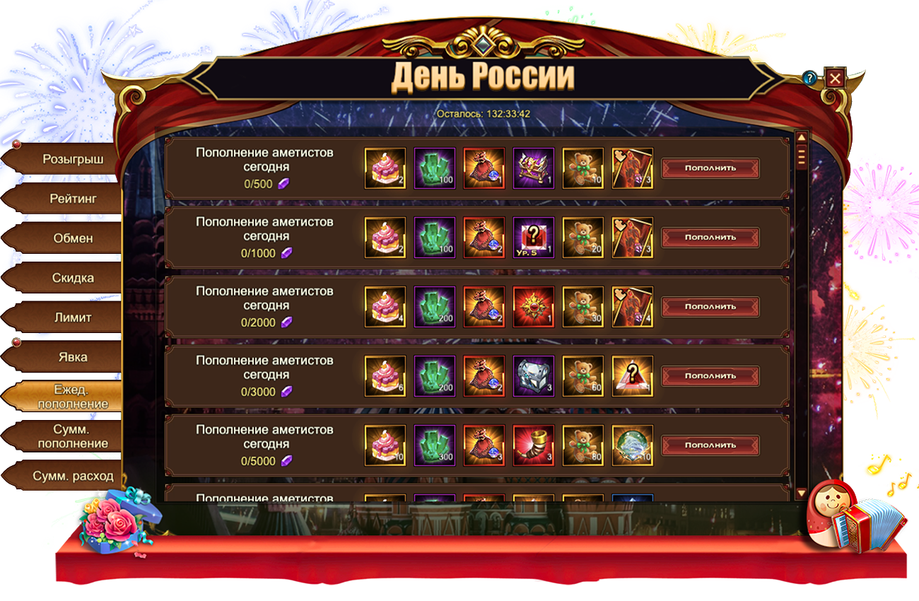 За пополнение счета на определенное количество аметистов за один день, вы можете получить: [Редк.] СтигматИзумруд, Сундук кристаллов 5 ур.Сундук камней элементаля 4 ур., Сундук самоцветов 6 ур., День России тортМедвежонок, Дух крыльев святости, Сундук с эссенцией стигмата, Сундук кристаллов 9 ур.Сундук кристаллов 7 ур., Сущность артефактаДух крыльев святостиФрагмент паука, Сундук редкостей, Сундук с кодексом, Письмо с молитвой, Простой горн[Фрагмент карты] Тюр.