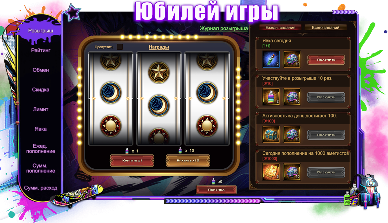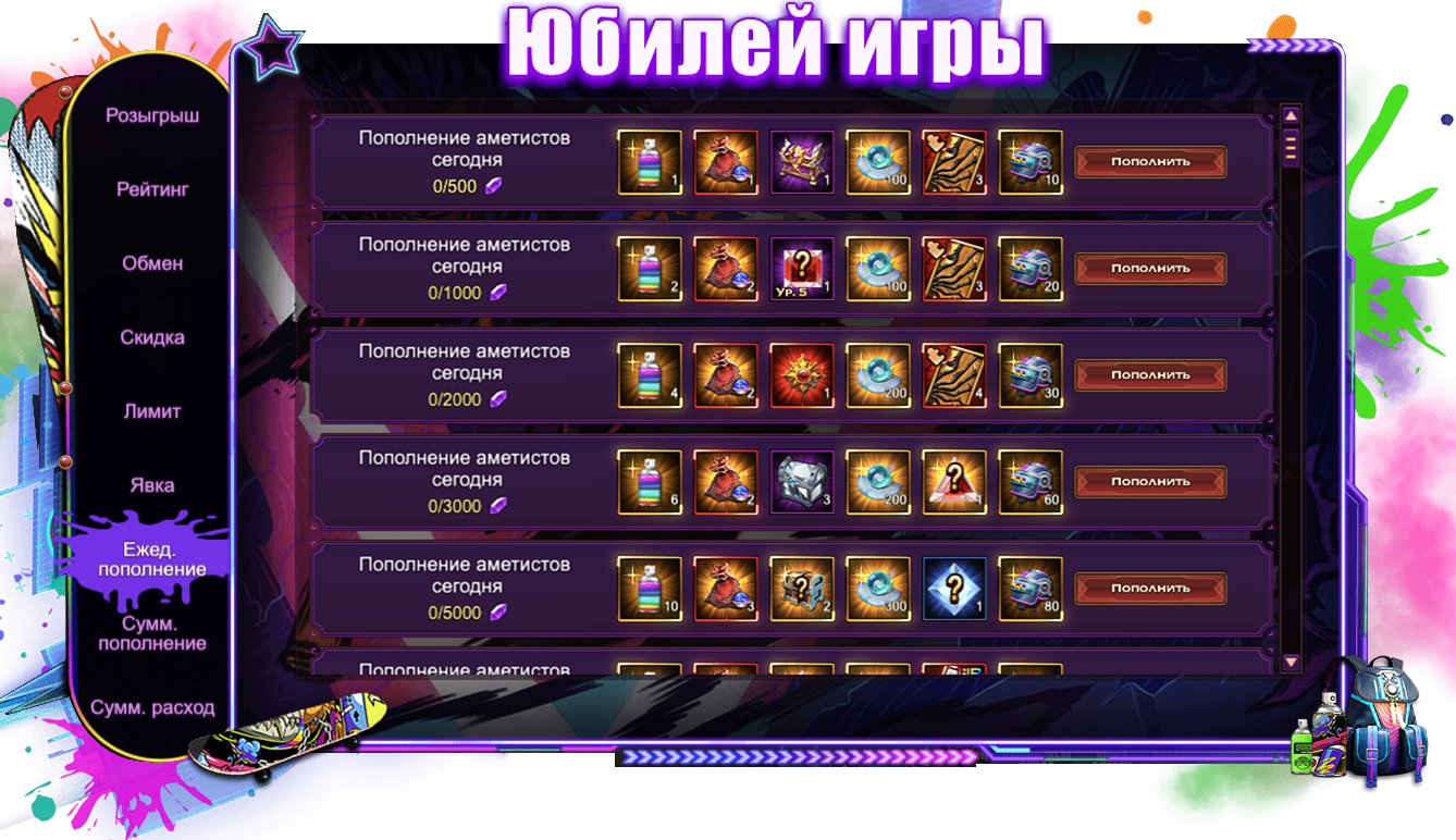За пополнение счета на определенное количество аметистов за один день, вы можете получить: [Редк.] Стигмат, [Героич.] Стигмат, Сундук кристаллов 5 ур., Сундук камней элементаля 4 ур., Сундук самоцветов 6 ур., Баллончик с краской, VR шлем, Эссенция Талисмана, Песок темной звезды, Сундук кристаллов 7 ур., Сундук кристаллов 9 ур., Сундук книг навыков, Сундук с эссенцией стигмата, Сущность артефакта, Сундук редкостей, Фрагмент крыльев дракона, Письмо с молитвой, Сунду карт UR, [Фрагмент карты] Тюр.