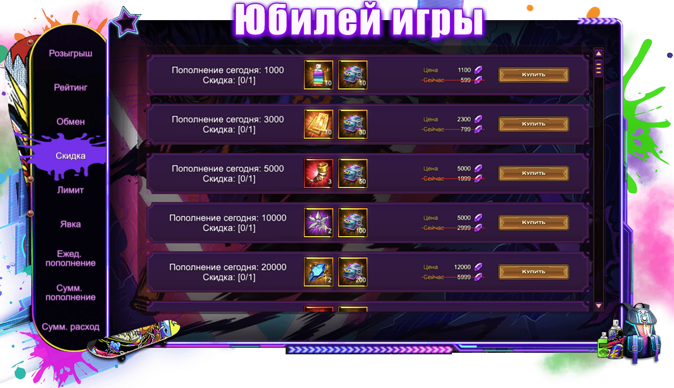 Обратите внимание, для активации скидки необходимо выполнить условие из первого столбца. Например, на скриншоте ниже для приобретения со скидкой набора из 10 Баллончиков с краской и 10 VR шлемов необходимо пополнить счет на 1000.