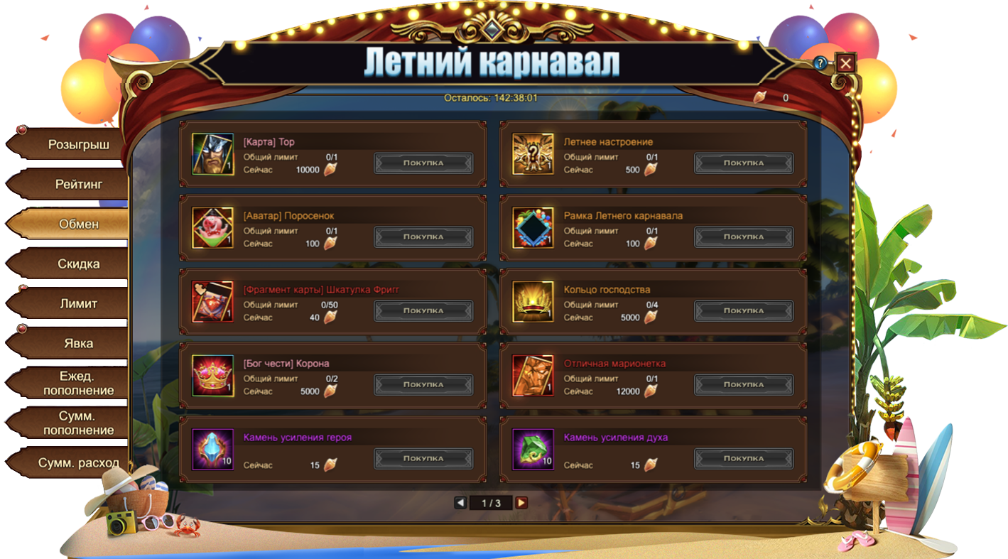 Морские раковины, собранные во время данного Фестиваля, позволяют приобрести множество интересных предметов, в том числе и эксклюзивных для данного события: [Карта] Тор, Особый титул Летнее настроение[Аватар] ПоросенокРамка Летнего карнавала[Фрагмент] Шкатулка Фригг. Если эксклюзивные предметы вас не интересуют, всегда можно обменять Морские раковины на полезные ресурсы. Например, на Кольцо господстваОтличная марионетка или [Бог чести] Корона