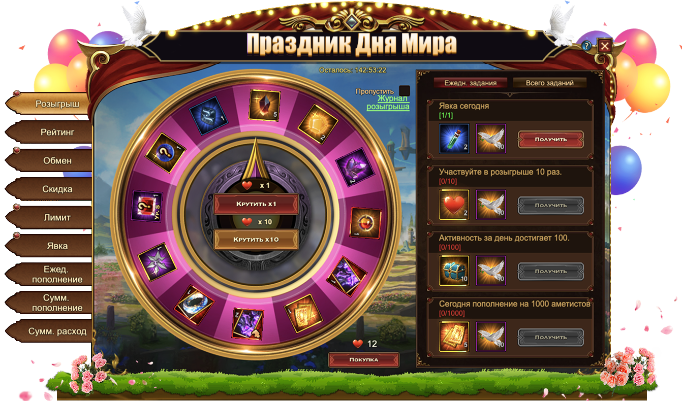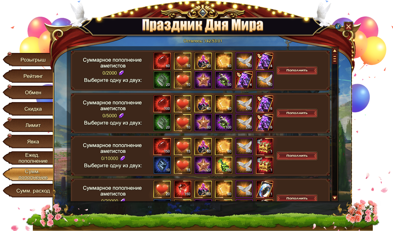 За пополнение счета на определенное количество аметистов за один день, вы можете получить: Сундук кристаллов 5 ур., Сундук самоцветов 6 ур., Сундук камней элементаля 4 ур., Голубь мира, Жетон дня мира, Цитрин, Сундук с эссенцией стигмата, Сундук кристаллов 9 ур., Сущность артефактаСундук редкостей, Письмо с молитвой, Простой горн, Сундук самоцветов 8 ур., Сундук снаряжения героя (красн.), Фрагмент светоцикла,[Фрагмент карты] Тюр.