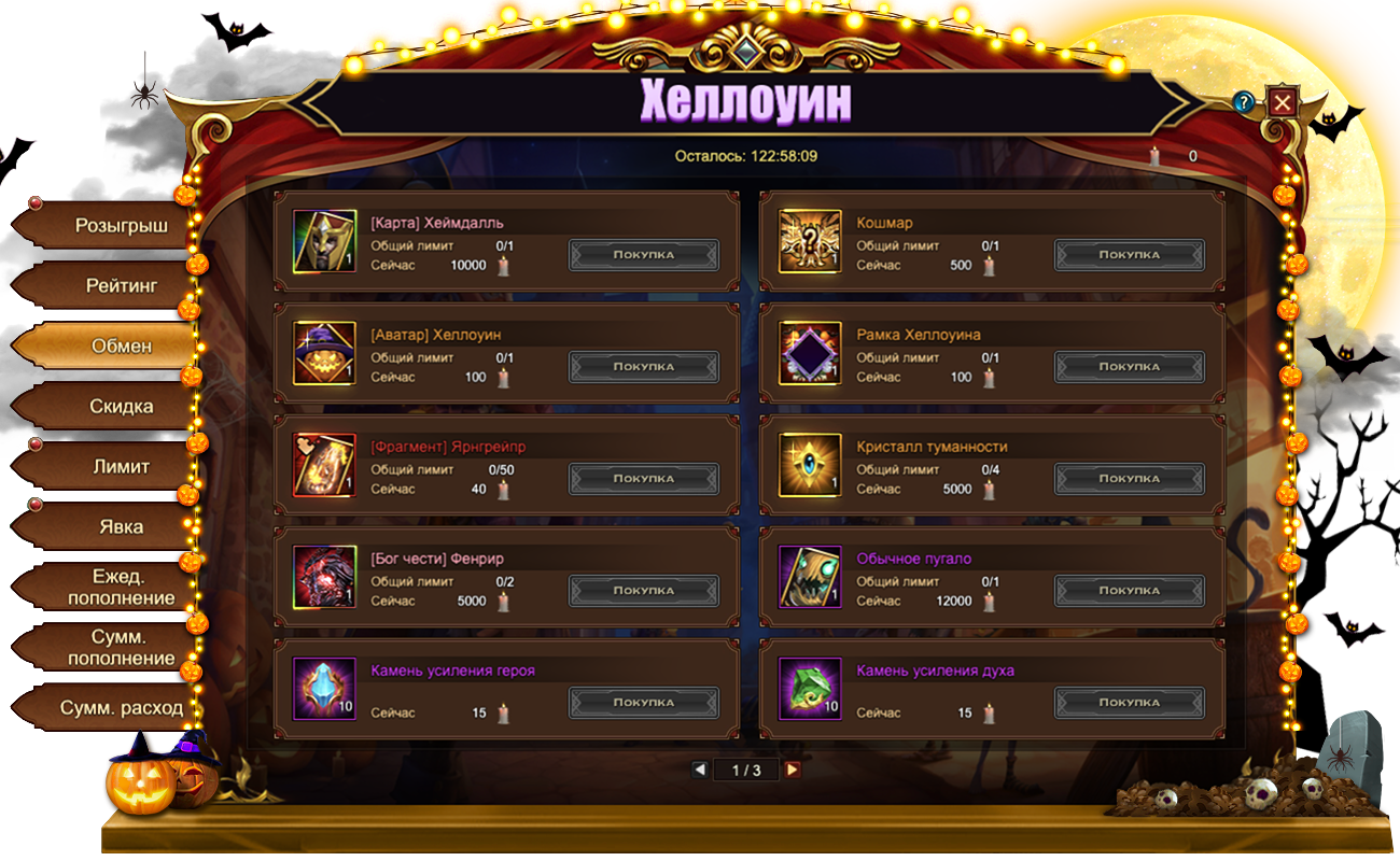 Обратите внимание, для активации скидки необходимо выполнить условие из первого столбца. Например, на скриншоте ниже, для приобретения со скидкой набора из 10 Ведьминых шляп и 10 Свечей необходимо пополнить счет на 1000.