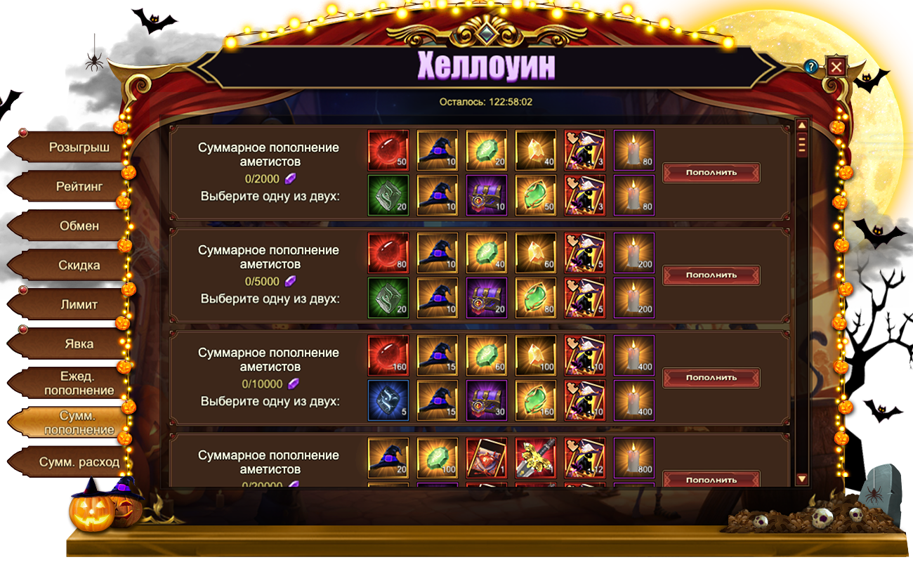 За пополнение счета на определенное количество аметистов за один день, вы можете получить: Сундук кристаллов 5 ур.Сундук камней элементаля 4 ур., СвечаВедьмина шляпа, Душа облика, Дух крыльев святости, Сундук кристаллов 7 ур.Сундук снаряжения питомца (оранж.)Сундук снаряжения героя (оранж.)Сундук книг навыковТурмалин, Сущность артефактаСундук редкостей, Письмо с молитвами, [Фрагмент] Волшебная метла, [Фрагмент карты] Тюр.