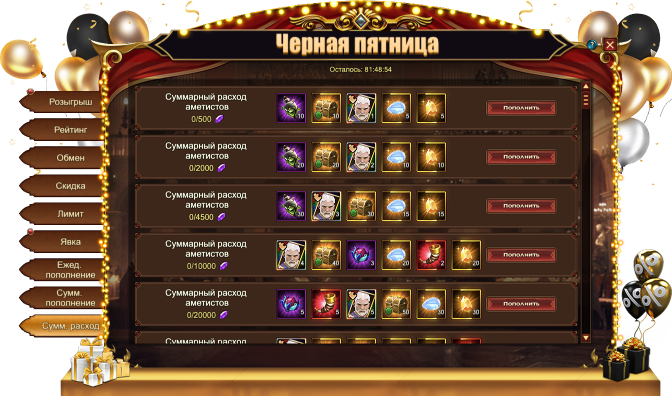 Купоны, собранные во время данного Фестиваля, позволяют приобрести множество интересных предметов, в том числе и эксклюзивных для данного события: [Карта] Локи, Особый титул Лучший покупатель[Аватар] Черная пятницаРамка Черной пятницы[Фрагмент карты] Череп ужаса. Если эксклюзивные предметы вас не интересуют, всегда можно обменять купоны на полезные ресурсы. Например, на Таинственный камень, Отличное приведение или [Бог чести] Меч