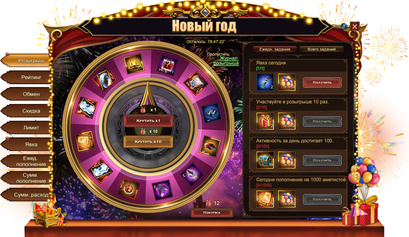 Участвуйте в розыгрыше различных ценных предметов, чтобы получить: Рутил, Мрачные одежды, Чароит, Сундук кристаллов 5 ур., Свиток славы, Кольцо господства, Кристалл чар демонов, Кристалл души крыльев, Сундук самоцветов 8 ур., Кольцо драупнир, Фрагмент ледяных крыльев и даже Ледяные крылья целиком.