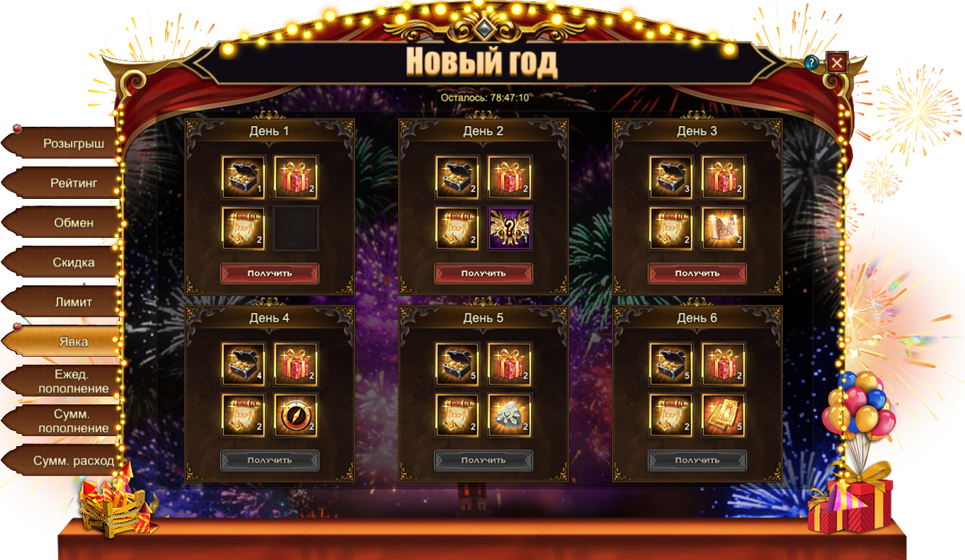 За посещение события ежедневно становятся доступны различные подарки. Например: Коробка сюрпризовСумка золота, Оранжевый свиток опыта, уникальный титул Яркие огни, Компас, Пропуск на Арену, Свиток славы.