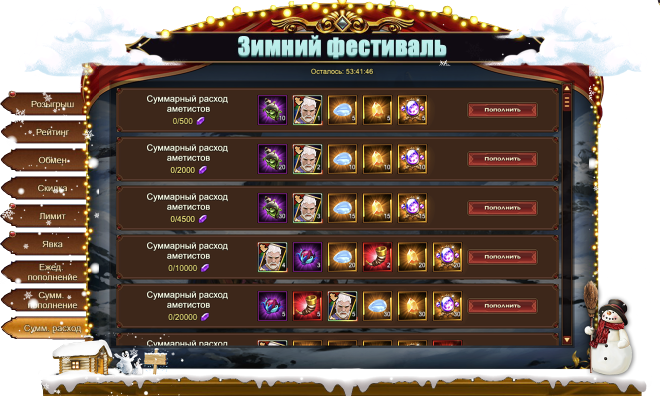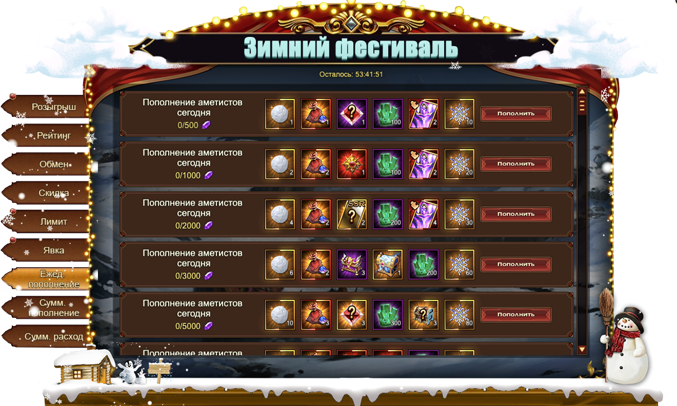 За пополнение счета на определенное количество аметистов за один день, вы можете получить: Изумруд, Сундук кристаллов 6 ур., Сундук камней элементаля 4 ур., Снежок, Снежинка, Цитрин, Сундук карт SSR, Сундук кристаллов 9 ур., Сундук самоцветов 7 ур., Сундук книг Навыков, Солнечный камень души, Сущность артефакта, Сундук редкостей, Фрагмент осуждения преступлений, Сундук с кодексом, Красное созвездие, Сундук снаряжения героя (красн.)[Фрагмент карты] Тюр.