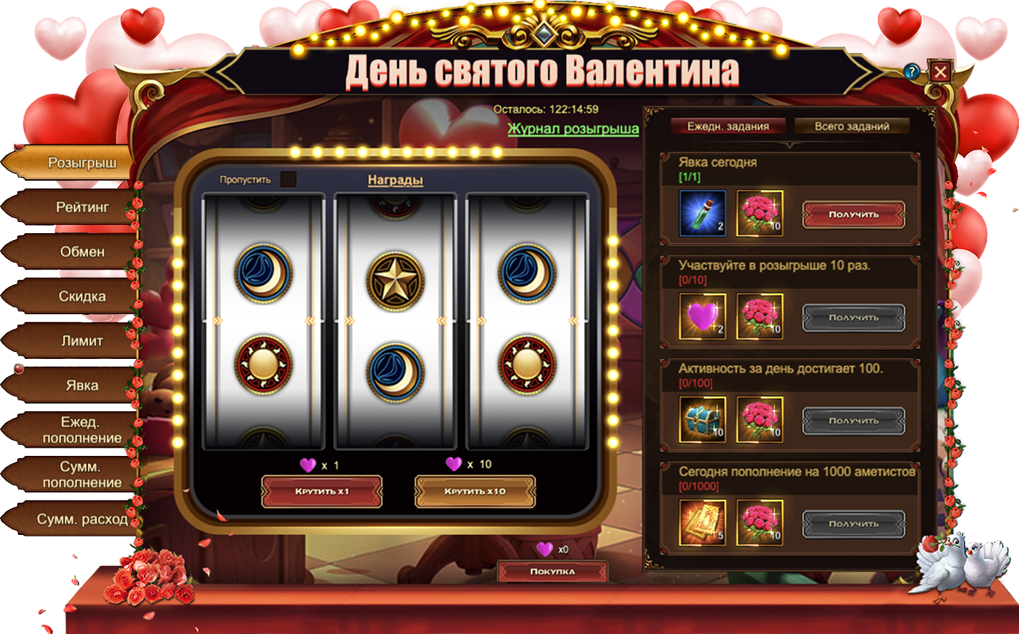Участвуйте в розыгрыше различных ценных предметов, чтобы получить: Рутил, Сундук кристаллов 5 ур., Мрачные одежды, Чароит, Песок темной звезды, Свиток славы, Кристалл чар демона, Кристалл души крыльев, Скидбладнир, Сундук наряда бога обмана, Фрагмент крыльев купидона и даже Крылья купидона целиком!