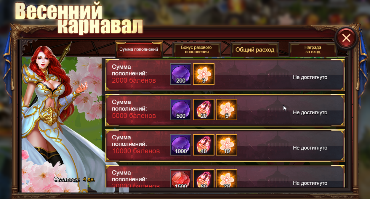 Весенний Карнавал предлагает сразу четыре активности: сумма пополнений, бонус разового пополнения, общий расход, награда за вход.