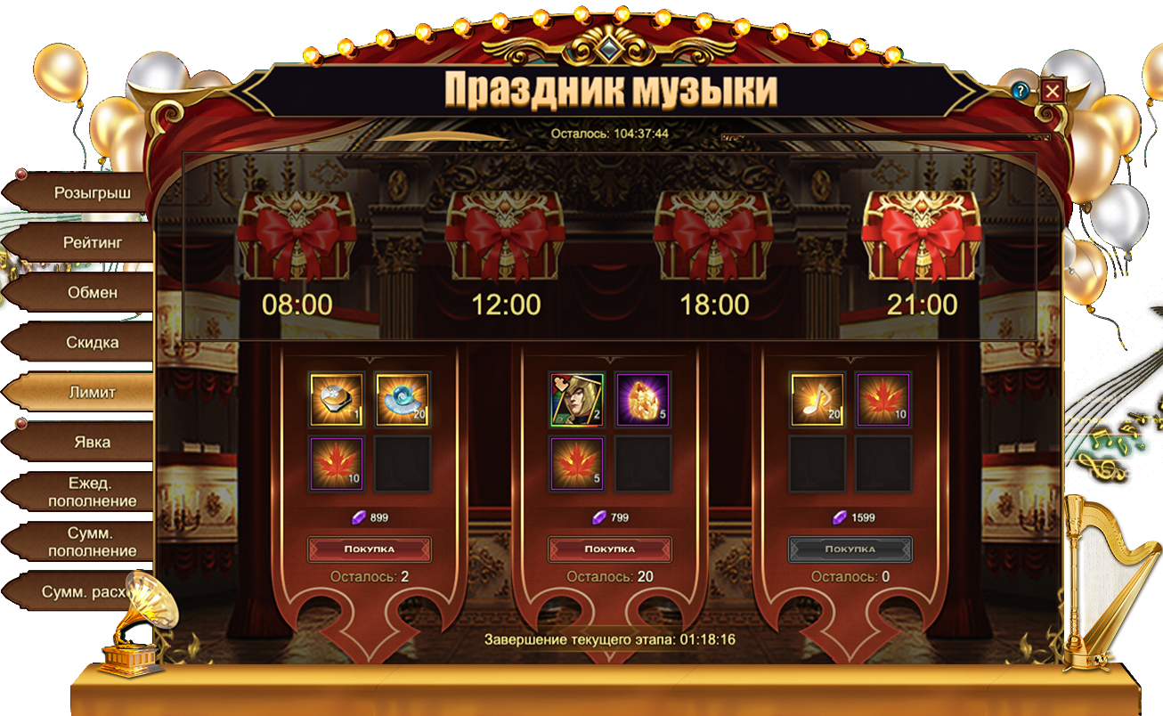 Здесь любопытные искатели приключений могут отыскать временные предложения, доступные в течение ограниченного времени и в ограниченном количестве. Группы товаров доступы с 8:00 до 11:59, с 12:00 до 17:59, с 18:00 до 20:59 и с 21:00 до 7:59. В этот раз вы можете получить в том числе: Янтарь, Эссенция талисмана, Саксофон, Ноты, Обучающее устройство, [Фрагмент Карты] Хеймдалль.