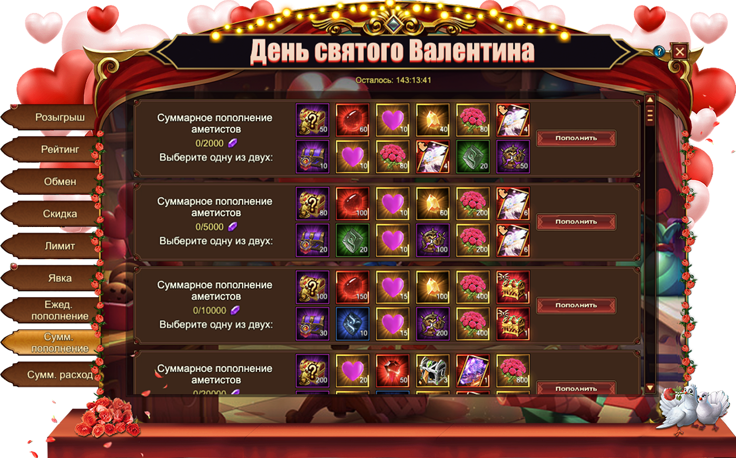 За пополнение счета на определенное количество аметистов за один день, вы можете получить: Изумруд, Сундук кристаллов 5 ур., Сундук камней элементалей 4 ур., [Героич.] Стигмат, Сердечки, Букет Роз, Дух крыльев святости, Песок темной звезды, Сундук кристаллов 7 ур., Сундук снаряжения питомца (оранж.), Сундук снаряжения героя (оранж.), Знак разрушения, Сущность артефакта, Сундук редкостей, Письмо с молитвой, Фрагмент крыльев купидона, Сундук самоцветов 8 ур., [Фрагмент Карты] Тюр!