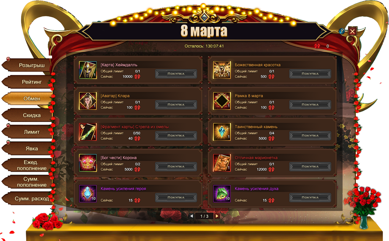 Здесь любопытные искатели приключений могут отыскать временные предложения, доступные в течение ограниченного времени и в ограниченном количестве. Группы товаров доступы с 8:00 до 11:59, с 12:00 до 17:59, с 18:00 до 20:59 и с 21:00 до 7:59. В этот раз вы можете получить в том числе: Янтарь, Эссенция талисмана, Обучающее устройство, [Фрагмент карты] Хеймдалль, Бант, Цветок богини.