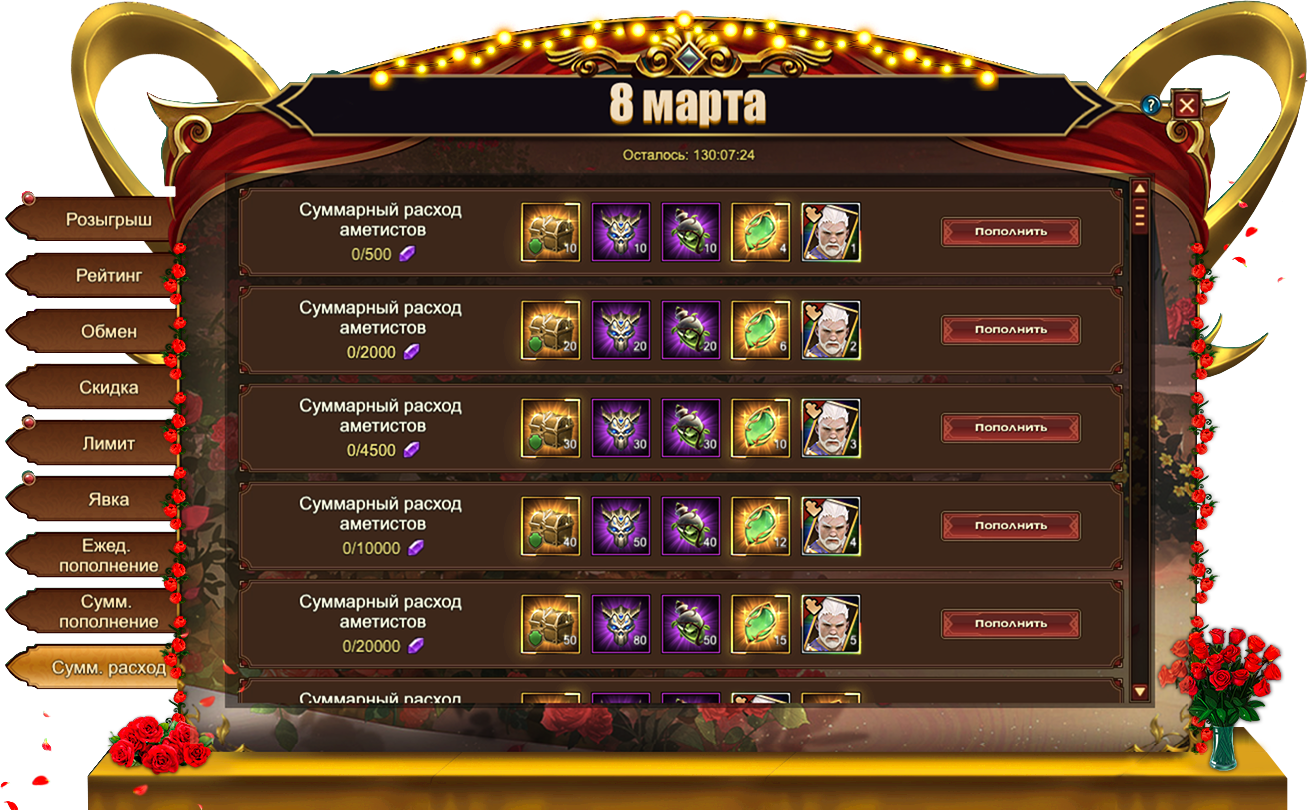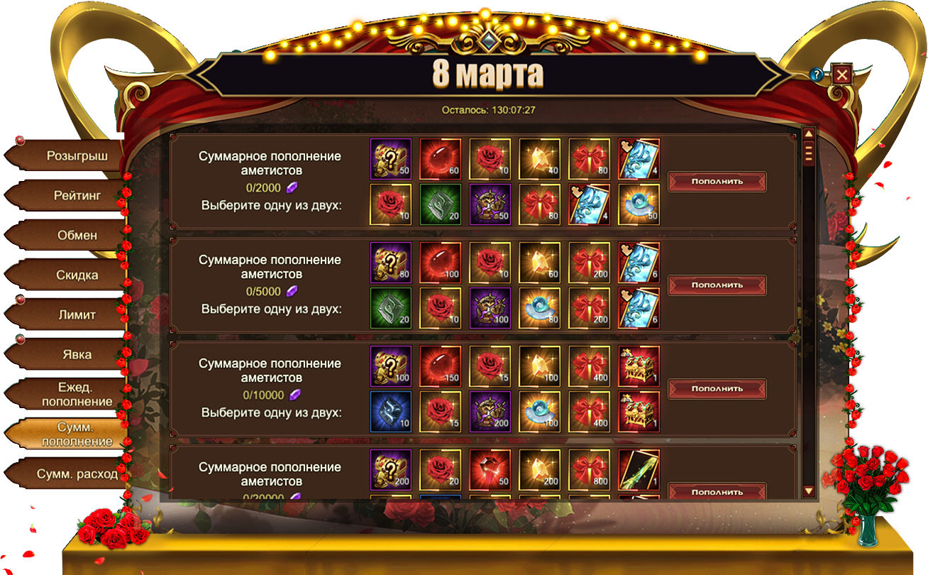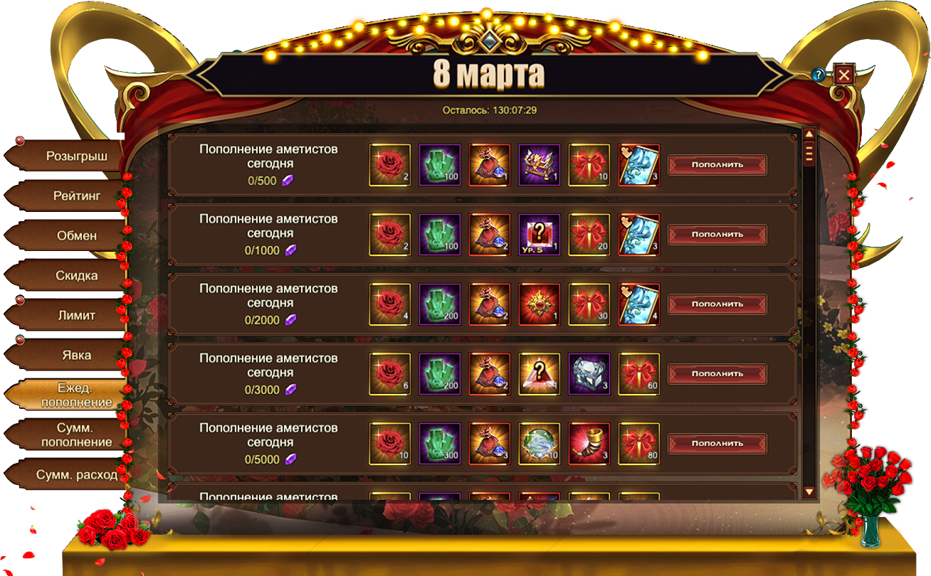 За пополнение счета на определенное количество аметистов за один день, вы можете получить: Изумруд, Сундук кристаллов 5 ур., Сундук камней элементаля 4 ур., Сундук самоцветов 6 ур., Цветок богини, Бант, Дух крыльев святости, Сундук кристаллов 7 ур., Сундук кристаллов 9 ур., Сундук с эссенцией стигмата, Сущность артефакта, Сундук редкостей, Сундук самоцветов 8 ур., Сундук с кодексом, Фрагмент голубого пера, Письмо с молитвой, Простой горн, [Фрагмент карты] Тюр.