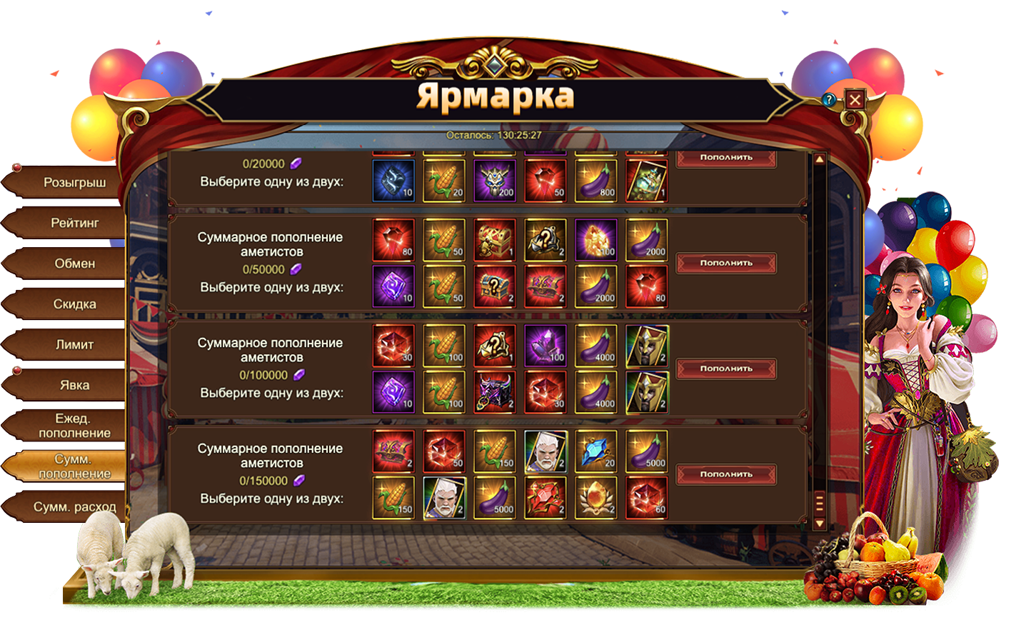 За пополнение счета на определенное количество аметистов за один день, вы можете получить: Изумруд, Сундук кристаллов 5 ур.Сундук камней элементаля 4 ур., Сундук самоцветов 6 ур., КукурузаБаклажан, Сундук кристаллов 9 ур., Сундук с эссенцией стигмата, Сущность артефактаПисьмо с молитвой, Простой горн, Сундук карт UR, Сундук снаряжения героя (красн.), Сундук редкостей, Фрагмент голубого крыла, [Фрагмент карты] Тюр.