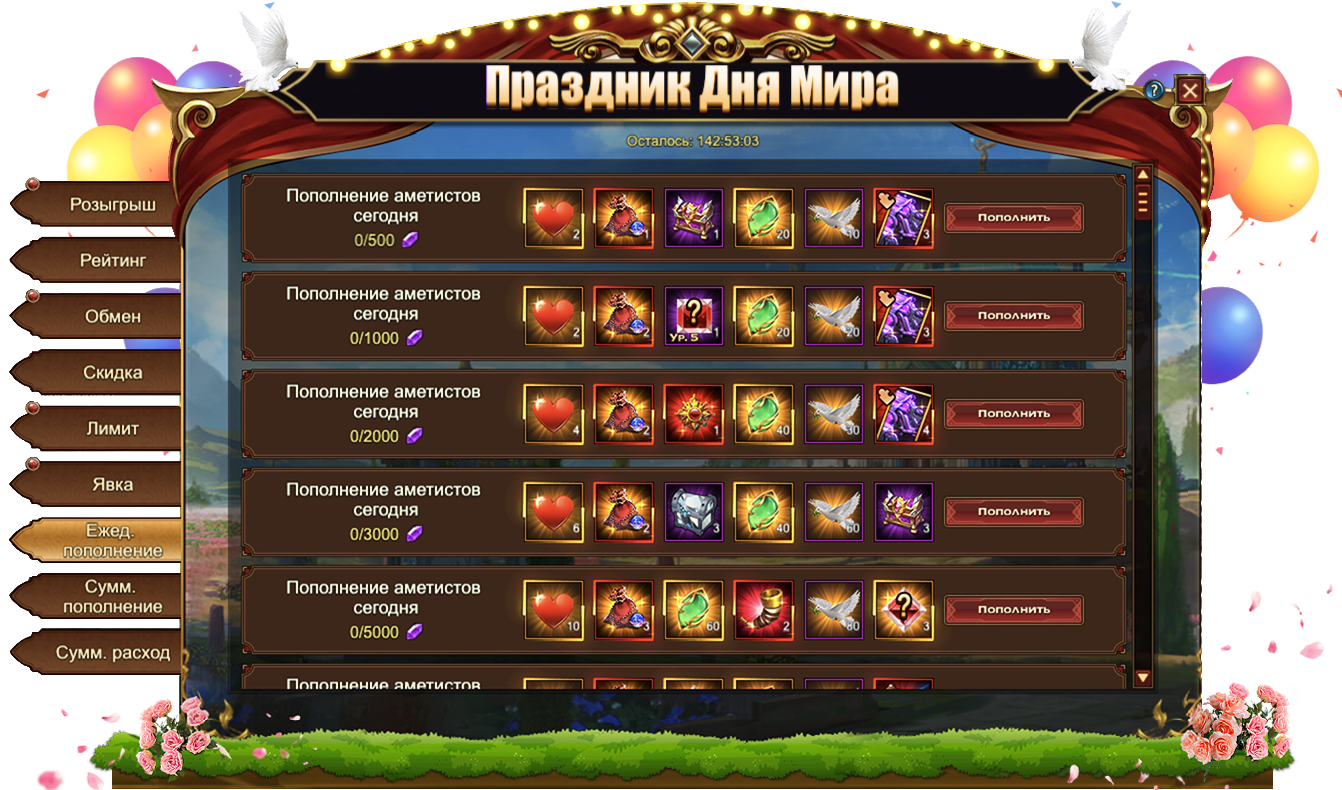 За пополнение счета на определенное количество аметистов за один день, вы можете получить: Сундук кристаллов 5 ур., Сундук самоцветов 6 ур., Сундук камней элементаля 4 ур., Голубь мира, Жетон дня мира, Цитрин, Сундук с эссенцией стигмата, Сундук кристаллов 9 ур., Сущность артефактаСундук редкостей, Письмо с молитвой, Простой горн, Сундук самоцветов 8 ур., Сундук снаряжения героя (красн.), Фрагмент светоцикла,[Фрагмент карты] Тюр.