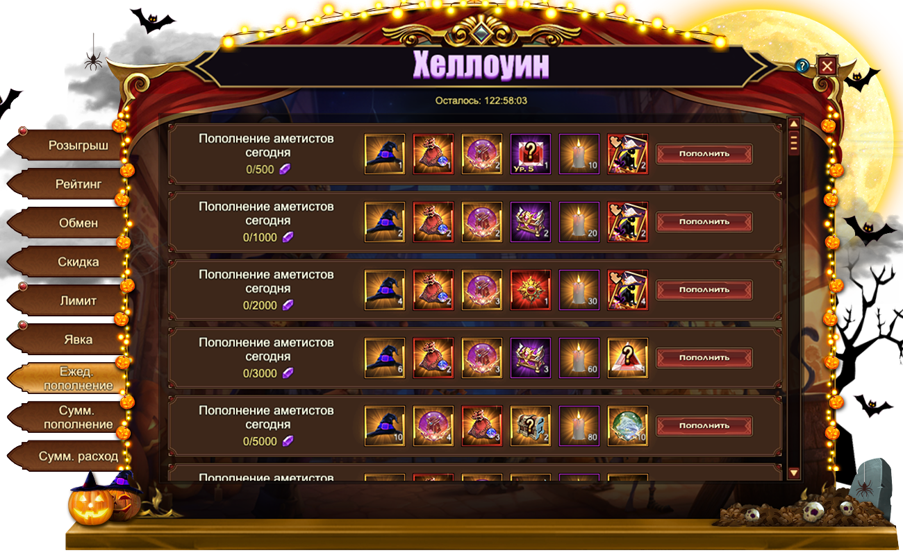 За пополнение счета на определенное количество аметистов за один день, вы можете получить: Сундук кристаллов 5 ур.Сундук камней элементаля 4 ур., СвечаВедьмина шляпа, Душа облика, Дух крыльев святости, Сундук кристаллов 7 ур.Сундук снаряжения питомца (оранж.)Сундук снаряжения героя (оранж.)Сундук книг навыковТурмалин, Сущность артефактаСундук редкостей, Письмо с молитвами, [Фрагмент] Волшебная метла, [Фрагмент карты] Тюр.