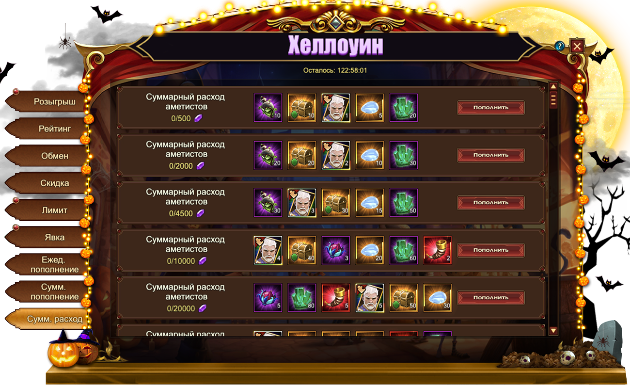 За пополнение счета на определенное количество аметистов за один день, вы можете получить: Сундук кристаллов 5 ур.Сундук камней элементаля 4 ур., СвечаВедьмина шляпа, Душа облика, Дух крыльев святости, Сундук кристаллов 7 ур.Сундук снаряжения питомца (оранж.)Сундук снаряжения героя (оранж.)Сундук книг навыковТурмалин, Сущность артефактаСундук редкостей, Письмо с молитвами, [Фрагмент] Волшебная метла, [Фрагмент карты] Тюр.