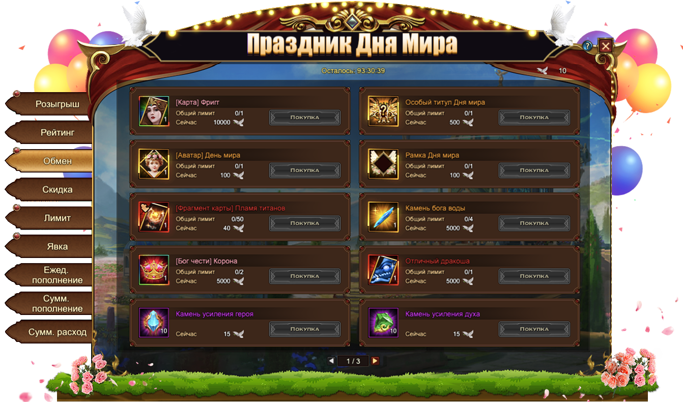 Голуби мира, собранные во время данного Фестиваля, позволяют приобрести множество интересных предметов, в том числе и эксклюзивных для данного события: [Карта] ФриггОсобый титул Дня мира[Аватар] День мираРамка Дня мира[Фрагмент карты] Пламя титанов. Если эксклюзивные предметы вас не интересуют, всегда можно обменять Голубей мира на полезные ресурсы. Например, на Камень бога водыОтличный дракоша или [Бог чести] Корона