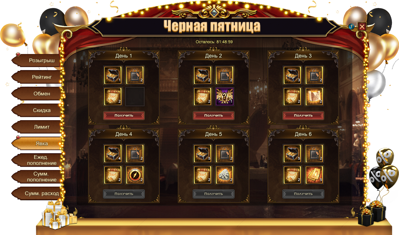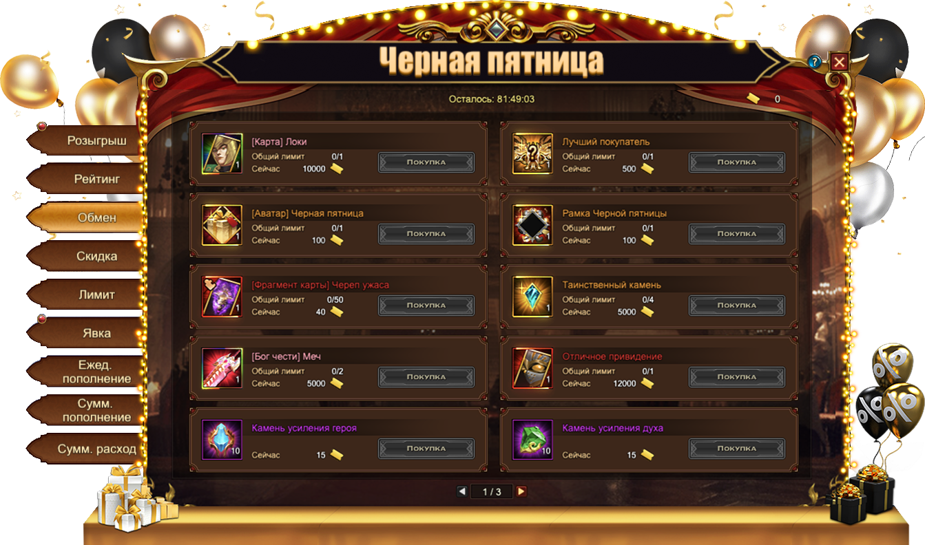 Купоны, собранные во время данного Фестиваля, позволяют приобрести множество интересных предметов, в том числе и эксклюзивных для данного события: [Карта] Локи, Особый титул Лучший покупатель, [Аватар] Черная пятница, Рамка Черной пятницы, [Фрагмент карты] Череп ужаса. Если эксклюзивные предметы вас не интересуют, всегда можно обменять купоны на полезные ресурсы. Например, на Таинственный камень, Отличное приведение или [Бог чести] Меч.
