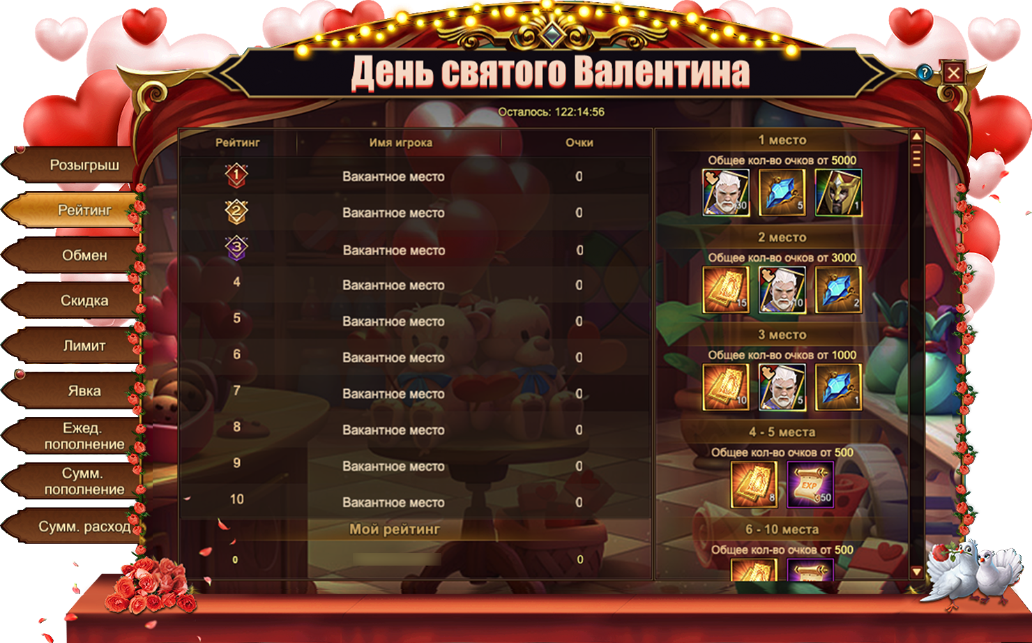 Участвуйте в розыгрыше различных ценных предметов, чтобы получить: Рутил, Сундук кристаллов 5 ур., Мрачные одежды, Чароит, Песок темной звезды, Свиток славы, Кристалл чар демона, Кристалл души крыльев, Скидбладнир, Сундук наряда бога обмана, Фрагмент крыльев купидона и даже Крылья купидона целиком!