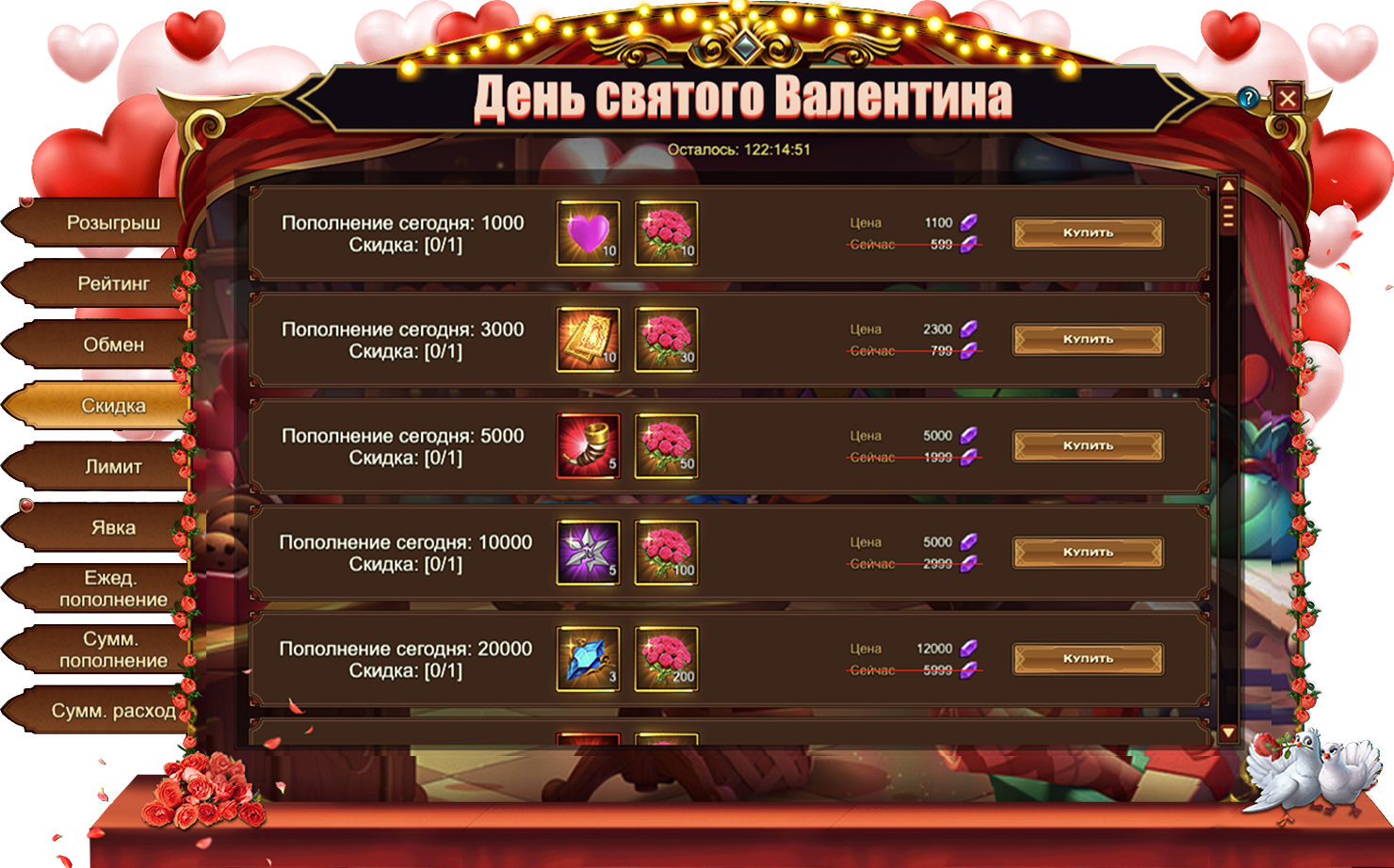 Обратите внимание, для активации скидки необходимо выполнить условие из первого столбца. Например, на скриншоте ниже, для приобретения со скидкой набора из 10 Сердечек и 10 Букетов роз необходимо пополнить счет на 1000.