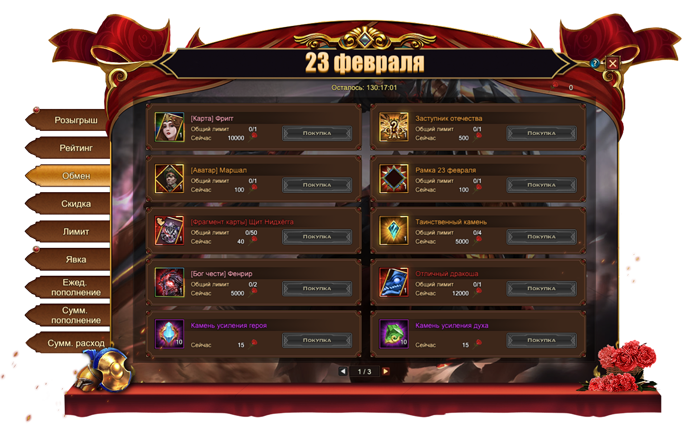 Букеты, собранные во время данного Фестиваля, позволяют приобрести множество интересных предметов, в том числе и эксклюзивных для данного события: [Карта] Фригг, титул Заступник Отечества[Аватар] МаршалРамка 23 февраля. Если эксклюзивные предметы вас не интересуют, всегда можно обменять Букеты на полезные ресурсы. Например, на Таинственный камень, [Бог чести] Фенрир и Отличный дракоша