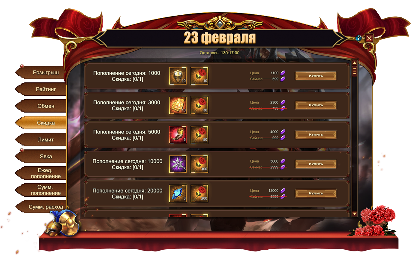 Обратите внимание, для активации скидки необходимо выполнить условие из первого столбца. Например, на скриншоте ниже, для приобретения со скидкой набора из 10 Орденов и 10 Букетов необходимо пополнить счет на 1000.